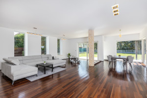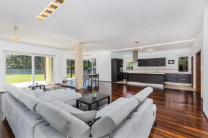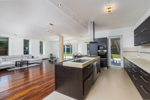 A minimál stílusban, minőségi anyagok felhasználásával, megépített, panorámás házat, beragyogja a fény, amit a gyönyörű nagy nyílászáróknak köszönhet. A ház amerikai konyhás nappalija 95 nm, nyáron a nyitott terasszal + 60 nm-es. Az elegáns konyha, korszerű gépekkel felszerelt.