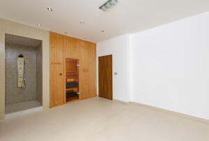 Fsz.: előtér, nappali- étkező, konyha, kamra, szauna, konditerem, gardrób, toalett, dupla garázs, tároló, kazánház, teraszok.